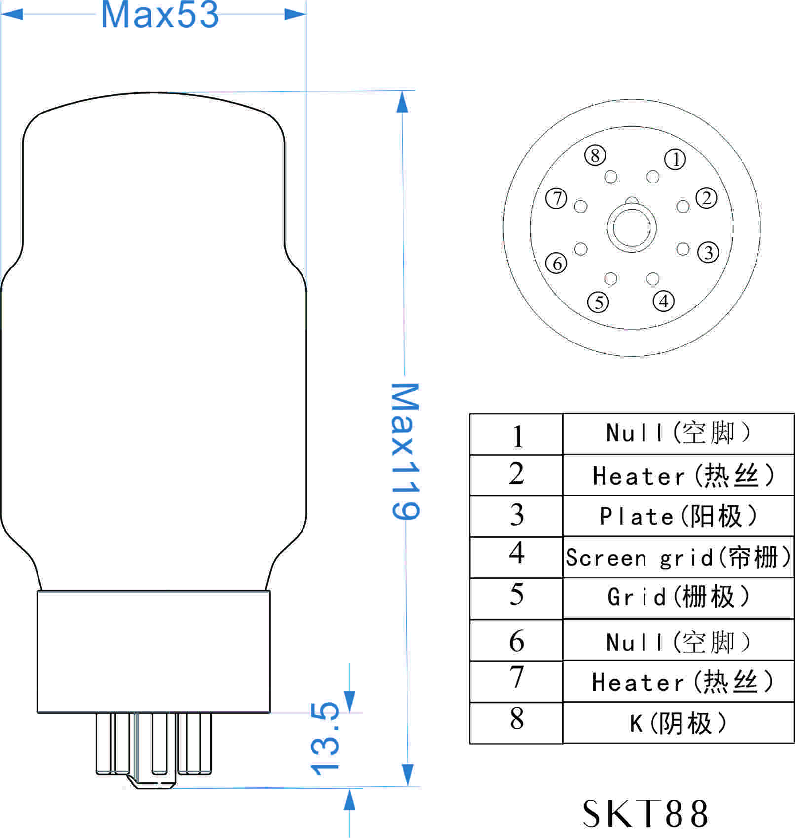 热丝电压 Uh………………………….............................6.3 V Ih…………………………..............................1.6 A 极限额定值 阳极电压………………………….................800 V 第二栅极电压………………….................600 V 第一栅极电压……………………..............-200 V 阳极耗散功率……………………...............42 W 第二栅极耗散功率…………………..........8 W 阳极加第二栅极耗散功率………........46 W 阴极电流…………………………................230 mA 热丝阴极间电压…………………………....200 V 玻壳温度…………………………................250 ℃ 第一栅极电阻 自偏压时 --- ---Pa + Pg2≤ 35W ......................0.47 MΩ --- ---Pa +Pg2 > 35W .........................0.27 MΩ 固定偏压时 --- ---Pa +Pg2≤35W .........................0.22 MΩ --- ---Pa +Pg2> 35W...........................0.10 MΩ 极间电容 四极管接法 三极管接法 输入电容…………………................ 16 9.3 PF 输出电容………………….................12 17 PF 跨路电容………………….................1.2 7.9 PF 静态参数 四极管接法 Ua…………………................................250 V Ug2……………….................................250 V Ia………………….................................140 mA Ig2(approx)……................................3 mA Ug1(approx)…….............................-15 V Gm…………………..............................12 mA/V ri ………………….................................12 KΩ μg1-g2……………............................8 三极管接法 Ua.g2……………................................250 V Ia+g2……………................................143 mA Ug1(approx)…...............................-15 V Gm…………………...............................12 mA/V ri………………….................................670 Ω μ………………….................................8 |